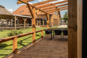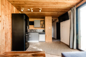 Domki składają się z: salonu, z 2 sypialni, łazienki, (1 sypialnia z podwójnym łóżkiem i 1 mała sypialnia z 2 pojedynczymi łóżkami, rozkładana podwójna sofa w salonie).