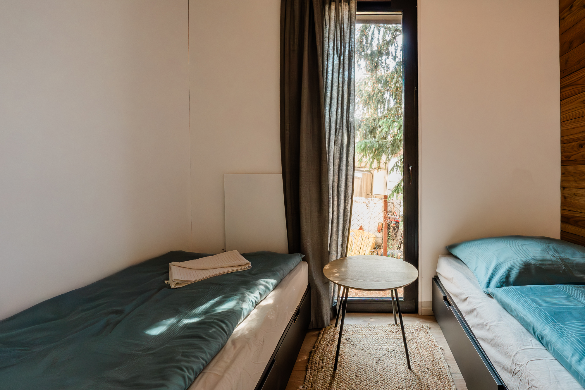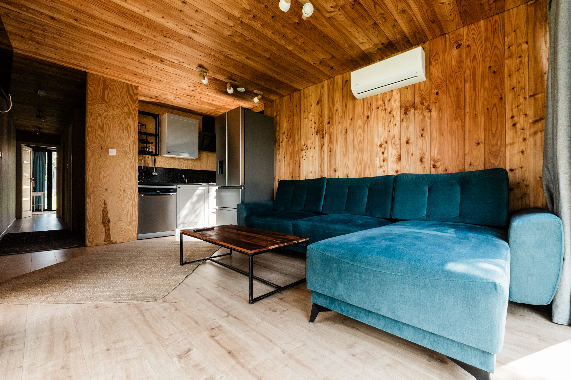 Domki składają się z: salonu, z 2 sypialni, łazienki, (1 sypialnia z podwójnym łóżkiem i 1 mała sypialnia z 2 pojedynczymi łóżkami, rozkładana podwójna sofa w salonie).